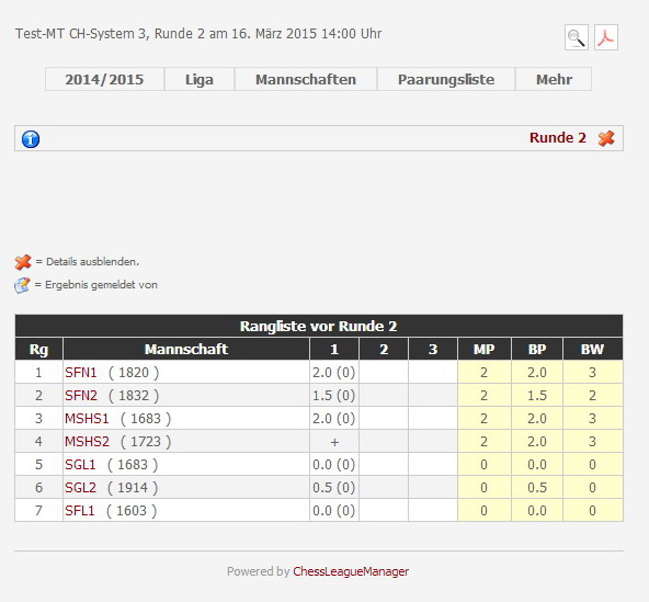 1) es werden schon zu Beginn alle Runden angelegt, zwar ohne Paarungen ab Runde 2, aber es gibt keine Möglichkeit, Paarungen berechnen zu lassen oder manuell nachzutragen.